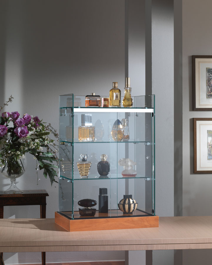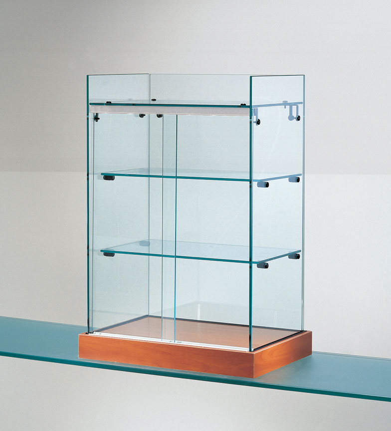 Bänkmonter i glas med skjutdörrar och två hyllplan.